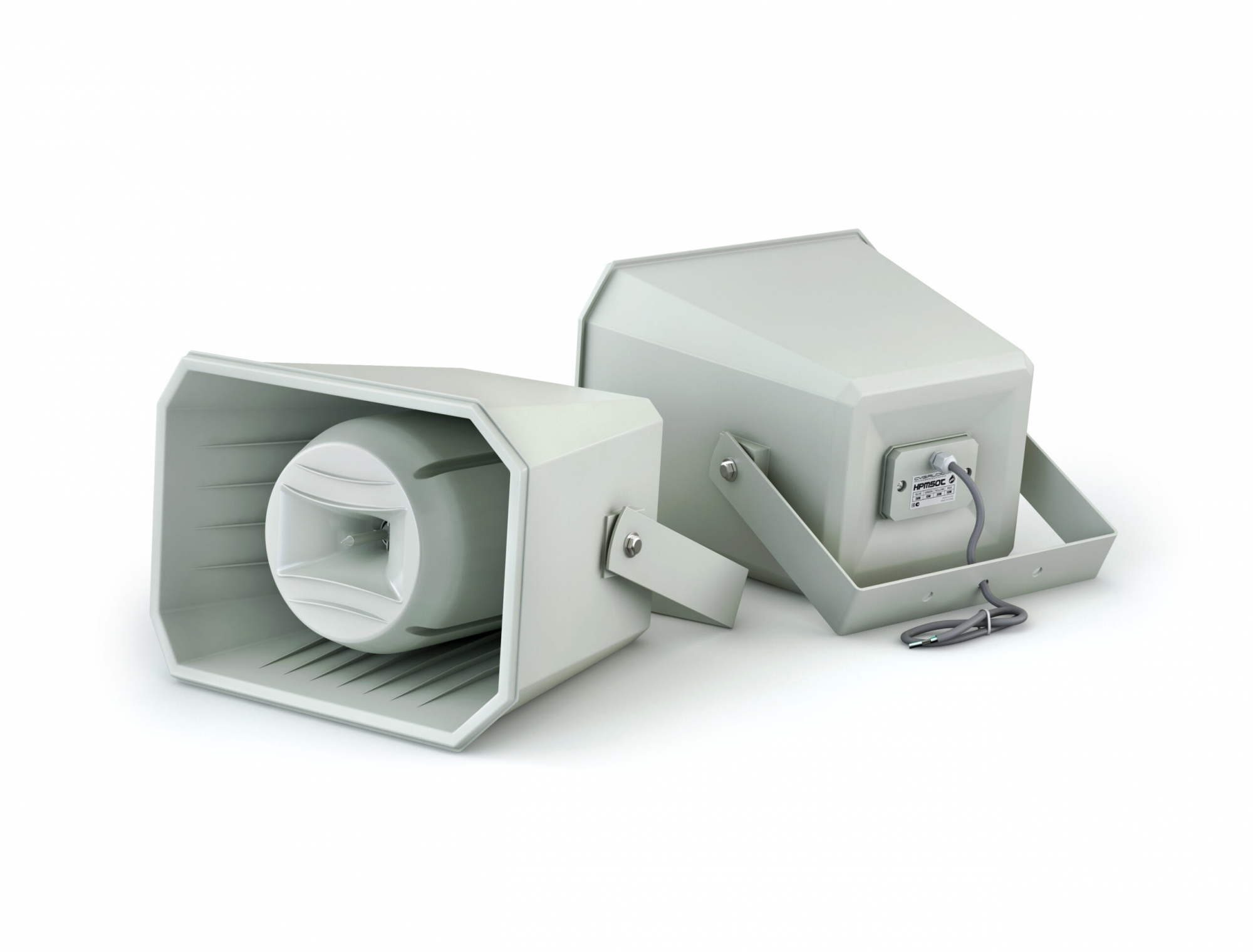 Двухполосный музыкальный рупорный громкоговоритель, мощность 15/30/50W - 100V, корпус из ABS пластика, влагозащищенный - IP65, цвет серый (RAL7032). В комплекте кронштейн для установки. Габаритный размер 362mm х 310mm х 252mm. Вес – 3,9кг.
