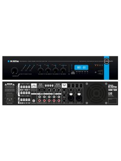 Профессиональный микшер-усилитель, встроенный модуль источника сигнала (MP3 - USB/SDcard, FM тюнер, Bluetooth), 4 управляемые спикерные зоны. Предназначен для качественных систем трансляции фоновой музыки и голосового оповещения, мощность 240W/100V, 3 line in (3x2RCA), 2 mic/line in (XLR/TRS), настраиваемый приоритет, фантомное питание 24V, управляющие контакты FULL MUTE, MUSIC MUTE, раздельный двухполосный EQ для линейных и микрофонных входов, индивидуальная настройка чувствительности для каждого входа, сквозной выход THROUGH OUT (2RCA) c входа LINE1 / MP3-FM модуль, линейный выход AUX LINK (RCA), управляемый выход OPERATED OUT (RCA), корпус 2U.