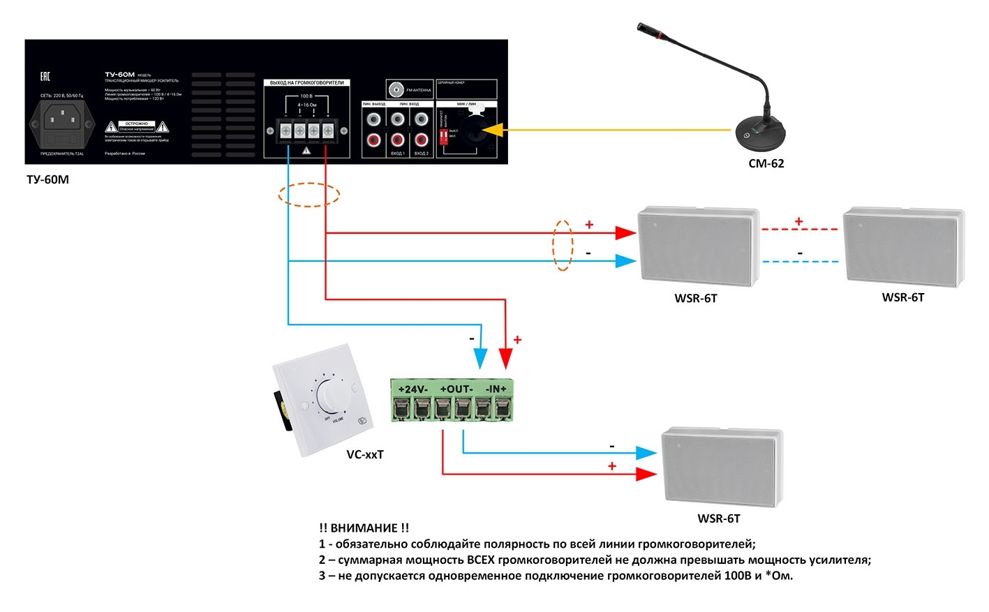 - Выход для подключения линии громкоговорителей с напряжением 100 В или подключения акустических систем с импедансом 4‑16 Ом;