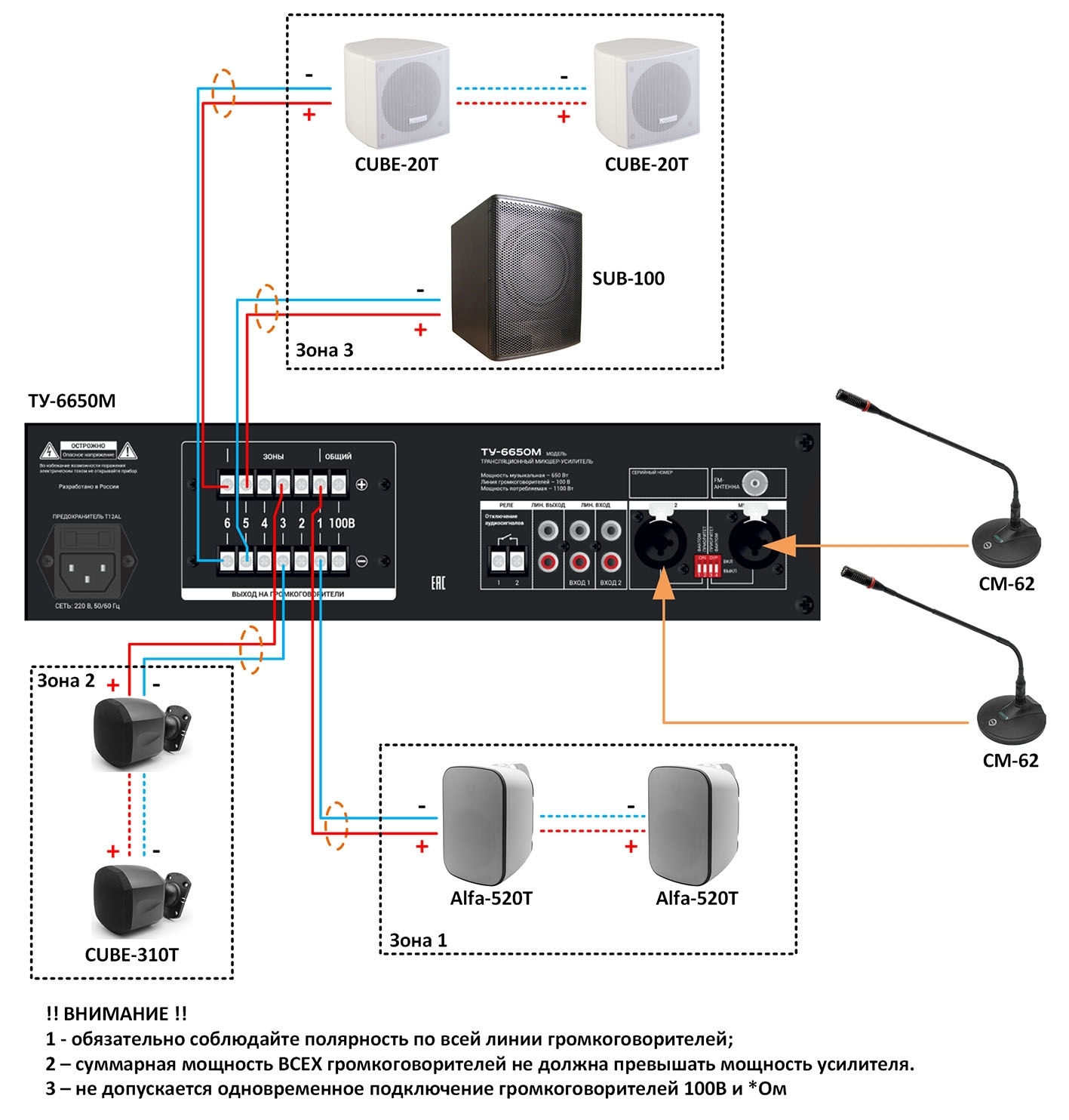 - «Выходная группа»: Линейный выход (разъем типа RCA). Шесть групп (зон) для подключения акустических систем в режиме 100 В. Разъемы выполнены на контактах «под винт»
