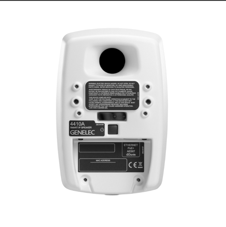 Genelec 4410AW активная 2-полосная АС с поддержкой Dante/AES67, НЧ 3" 25Вт, ВЧ 0.75" 25Вт. Звук, управление и электропитание - в одном CAT кабеле. Поддержка PoE/PoE+. Вход: RJ-45, дополнительный аналоговый вход euroblock 10кОм, балансный. Макс. SPL 96 дБ, 67Гц-40кГц (±6 дБ). Кроссовер 3кГц. Габариты (ВхШхГ): 181х121х115мм. Вес 1.5кг. Белая