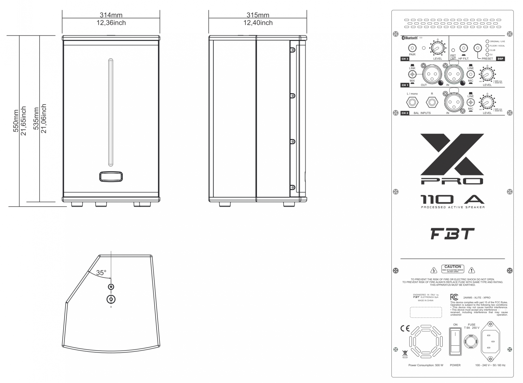 FBT X-PRO 110A оснащен би-амп усилителем мощностью 1200 Вт для НЧ и усилителем мощностью 300 Вт для ВЧ.